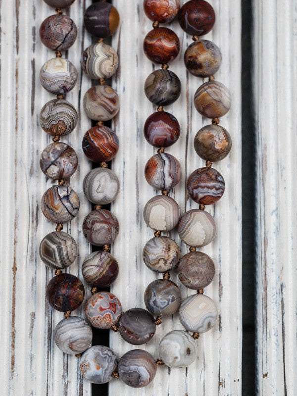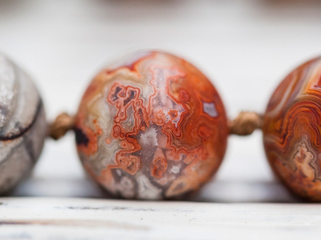 Laguna Lace agate gets its name as a hybrid of Crazy Lace agate and Laguna agate. It is a variety of Mexican Crazy Lace agate. Crazy Lace is a variety of agate that features "crazy" twists and turns in the banding.