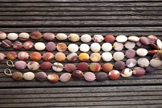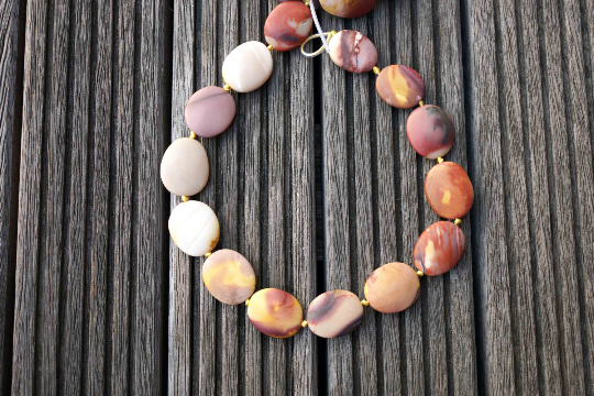 Mookaite is an Australian jasper that combines the lighter colors of yellow and red jasper. It encourages the desire for new experiences and helps to keep a balance between external activities and the internal response to these.
