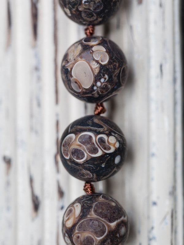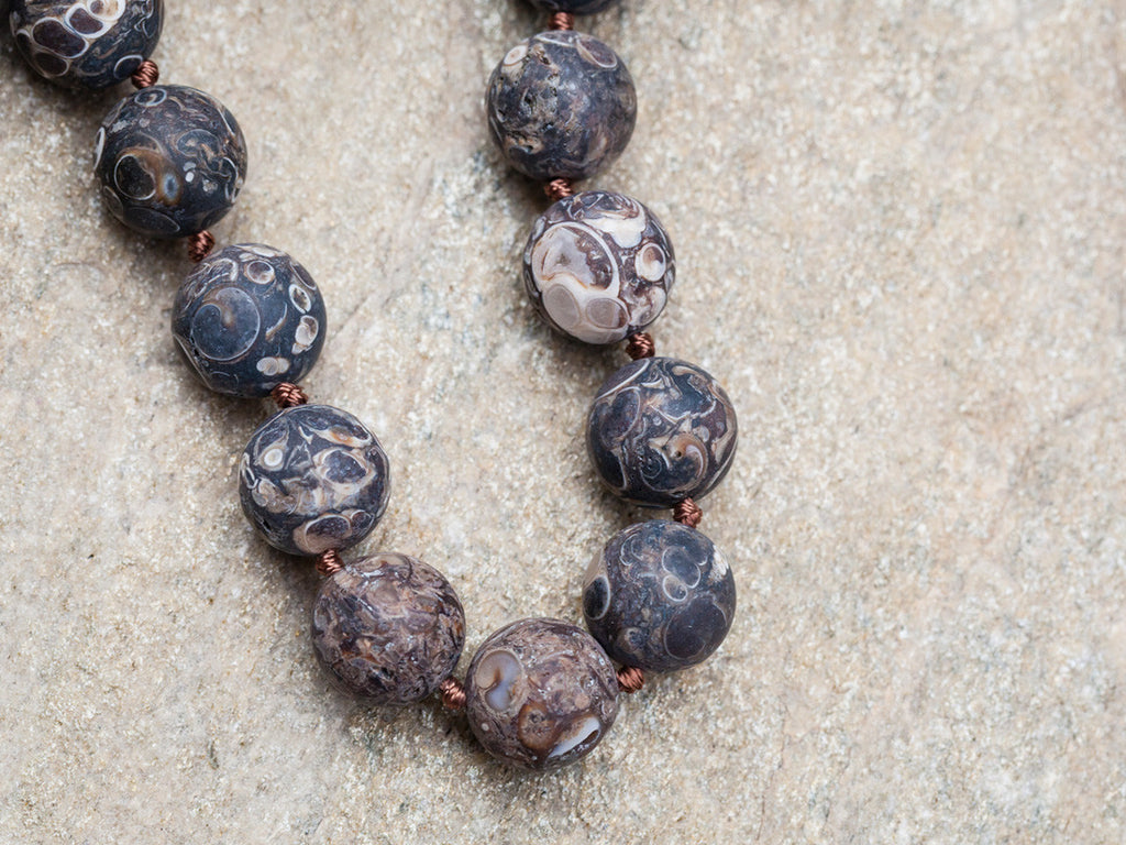 Turritella agate is a variety of Chalcedony, a mineral of the Quartz family. It is rich, earthy brown or black, and recognized by the sea creature and fossilized snail patterns within the stone, or in a thick coating around it.