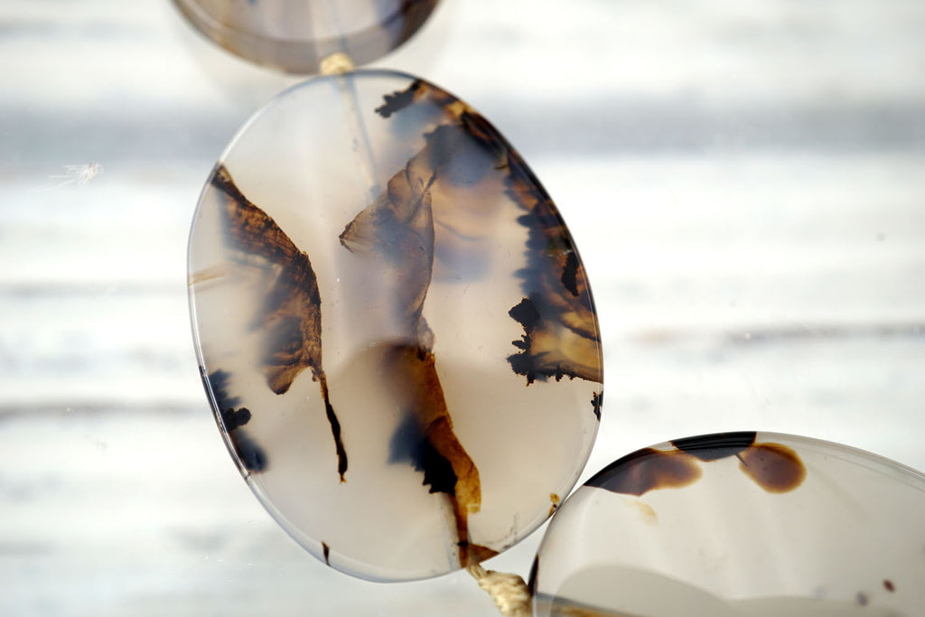 Moss agate (also called mocha stone) is a semi-precious gemstone formed from silicon dioxide. It is a form of chalcedony which includes minerals of a green colour embedded in the stone, forming filaments and other patterns suggestive of moss. It also sometimes resembles blue-cheese.