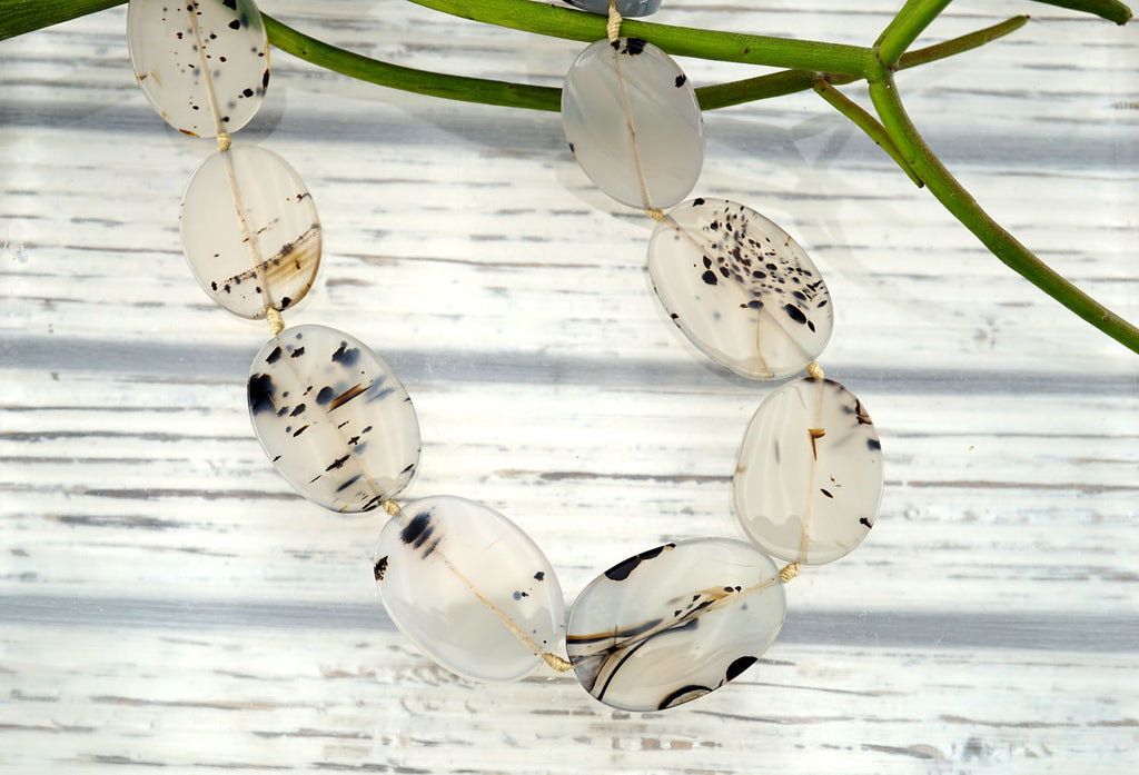 The field is a clear or milky-white quartz, and the included minerals are mainly oxides of manganese or iron. It is not a true form of agate, as it lacks agate's defining feature of concentric banding. Moss agate is of the white variety with green inclusions that resemble moss. It occurs in many locations.