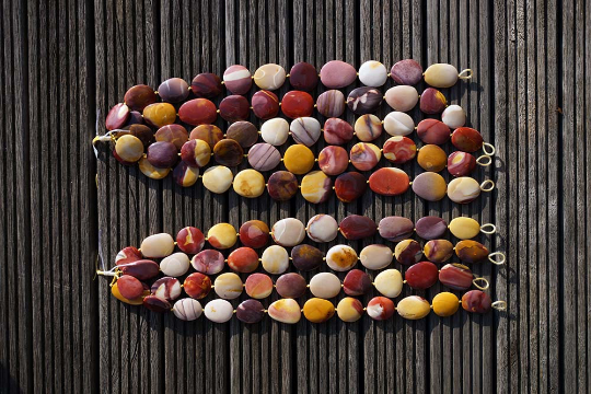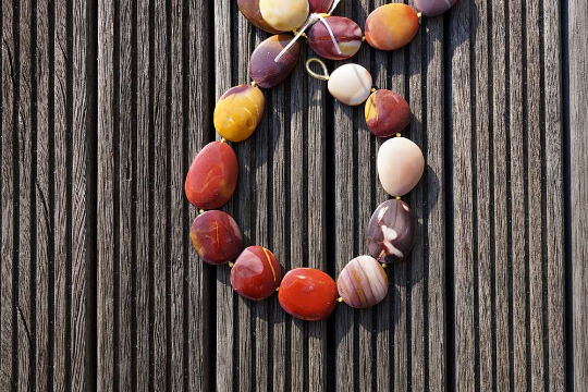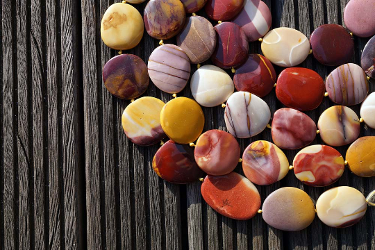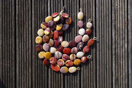 Mookaite is an Australian jasper that combines the lighter colors of yellow and red jasper. It encourages the desire for new experiences and helps to keep a balance between external activities and the internal response to these.