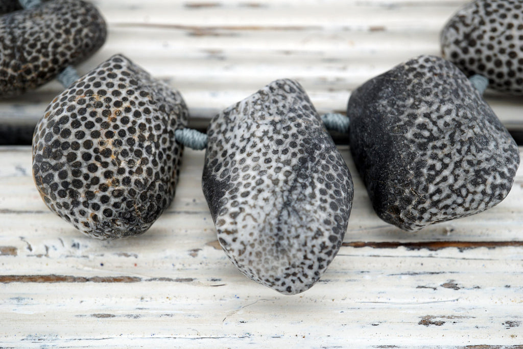 Bryozoan Coral is a rare fossilized coral. It has a rather unusual pattern, it is black/grey/white with distinctive spots/dots spreads across the stone, sometimes it is cut in a way that in fans out and radiates from one point to the edges.