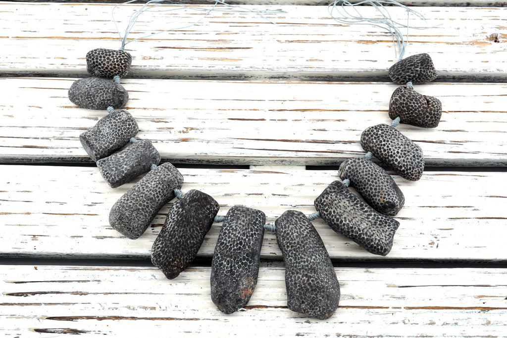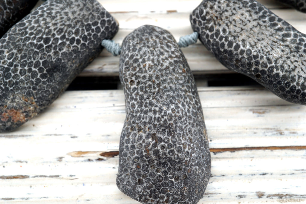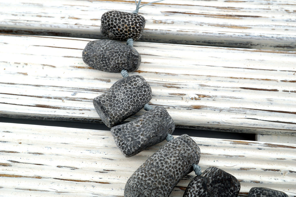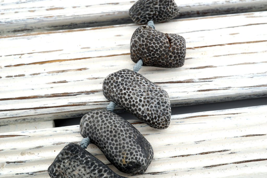 Bryozoan Coral is a rare fossilized coral. It has a rather unusual pattern, it is black/grey/white with distinctive spots/dots spreads across the stone, sometimes it is cut in a way that in fans out and radiates from one point to the edges.