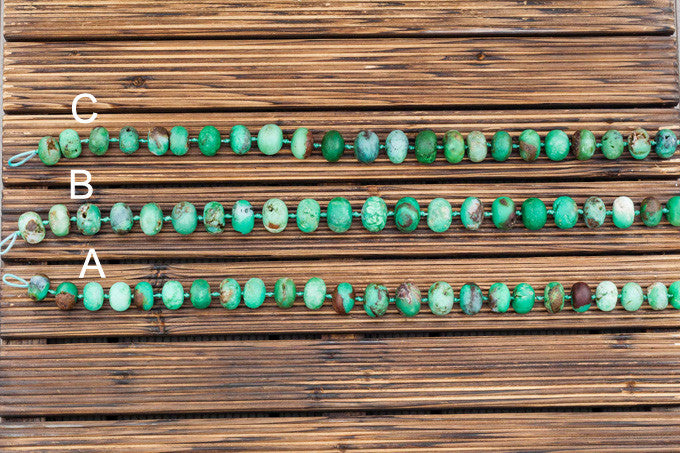 Chrysoprase is cryptocrystalline, which means that it is composed of crystals so fine that they cannot be seen as distinct particles under normal magnification.This sets it apart from rock crystal, amethyst, citrine, and the other varieties of crystalline quartz which are basically transparent and formed from easily recognized six-sided crystals. Other members of the cryptocrystalline silica family include agate, carnelian, and onyx. Unlike many non-transparent silica minerals, it is the color of chrysoprase, rather than any pattern of markings, that makes it desirable. The word chrysoprase comes from the Greek χρυσός chrysos meaning 'gold' and πράσινον prasinon, meaning 'green'.(source: wikipedia)