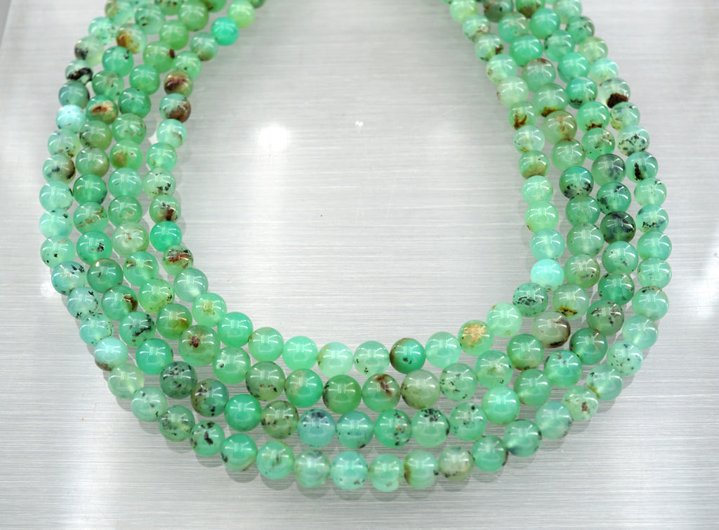 Chrysoprase is cryptocrystalline, which means that it is composed of crystals so fine that they cannot be seen as distinct particles under normal magnification. This sets it apart from rock crystal, amethyst, citrine, and the other varieties of crystalline quartz which are basically transparent and formed from easily recognized six-sided crystals. Other members of the cryptocrystalline silica family include agate, carnelian, and onyx. Unlike many non-transparent silica minerals, it is the color of chrysoprase, rather than any pattern of markings, that makes it desirable. The word chrysoprase comes from the Greek χρυσός chrysos meaning 'gold' and πράσινον prasinon, meaning 'green'.(source: wikipedia)