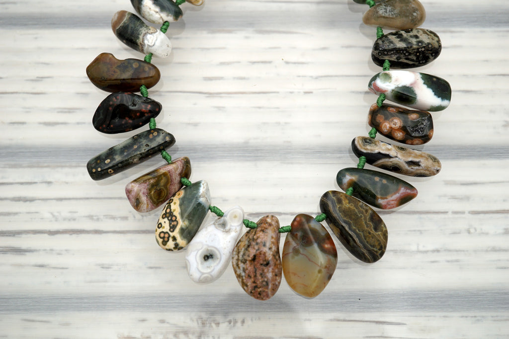 It (also called Orbicular Jasper) is an unusual jasper found only at a remote location on the coast of Madagascar that can only be mined at low tide! The colors vary widely - including white, green, pink, red, black, blue. The wild polka dots, wavy lines, multi colored floret patterns of Ocean Jasper make this a gorgeous and exciting stone.