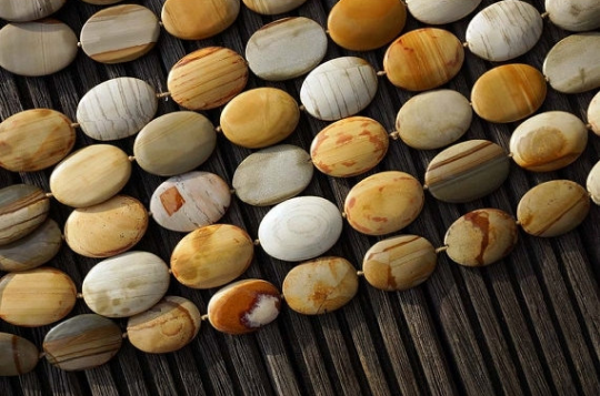 Owyhee Sunset Jasper is known as the “King” of all picture jaspers. It consists of patterns of golds, tans and reds to form beautiful desert scenes in the gemstones.
