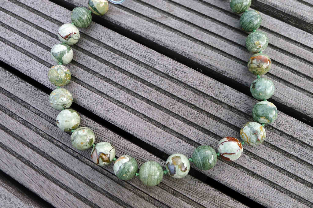 Rainforest rhyolite (also called Rainforest Jasper, Australian Rainforest Jasper) is similar visually to Jasper with its bright, intense colors and a smooth, shiny polish, but Rhyolite actually has a composition closer to granite, with a much smaller grain size. Rhyolite frequently contains voids and glassy fragments, which is due to rapid cooling. The unusual patterns in lovely, protective Rainforest Rhyolite, is where this stone gets its power to heal. Associated with the Heart Chakra, Rainforest Rhyolite is thought to help people deal with past-life issues, by helping one to see the relationship between karma and what is happening now, making these issues much easier to accept and work though. Rainforest Rhyolite will assist one in the laying down of burdens which no longer act to serve in one’s life. Using Rainforest Rhyolite may help with healing old and deep emotional wounds in this lifetime as well.