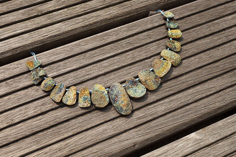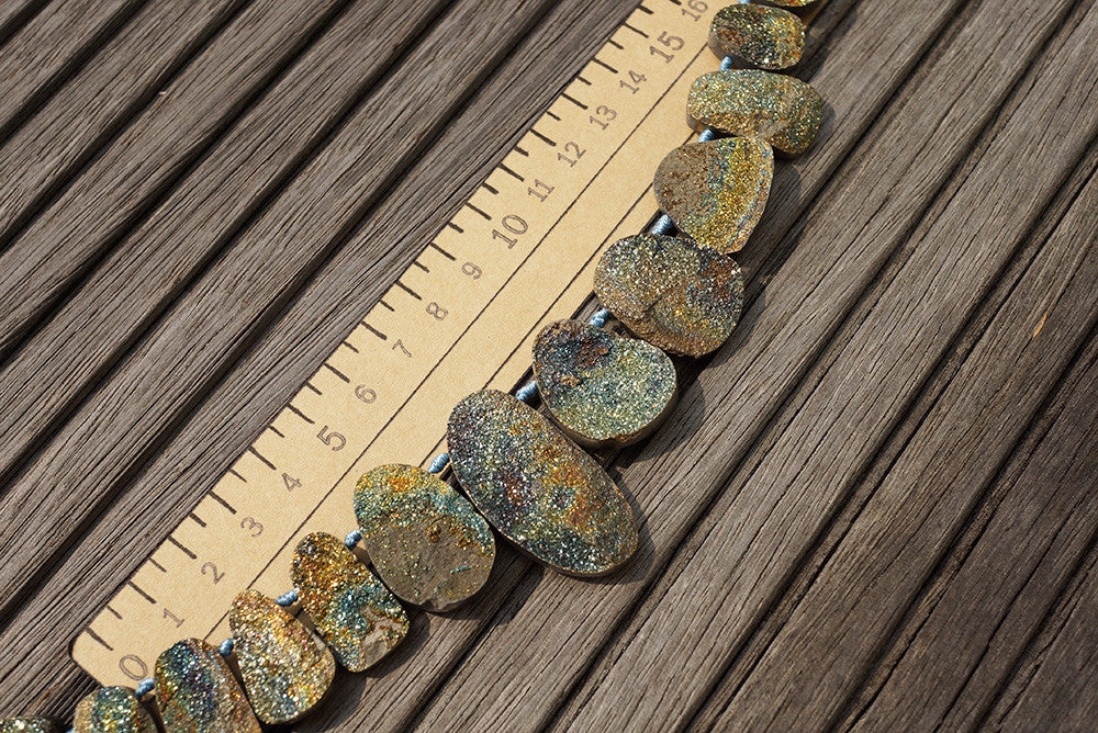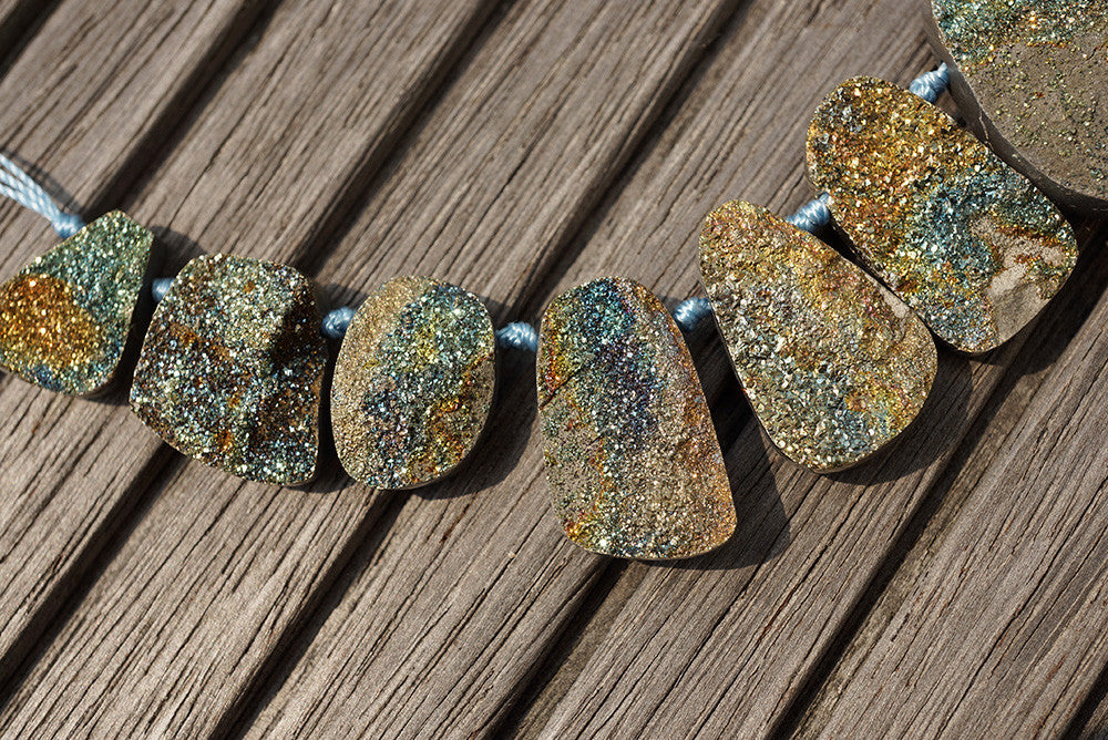 Rainbow (iridescent) pyrite is a relatively new gemstone recently discovered in Russia. This material comes in the form of “druzy” - a fine layer of miniature crystals coating a matrix. It offers a shimmering rainbow of colors, including shades of gold, green, pink and blue. This unique stone is found not far from Ulianovsk, on Volga River.