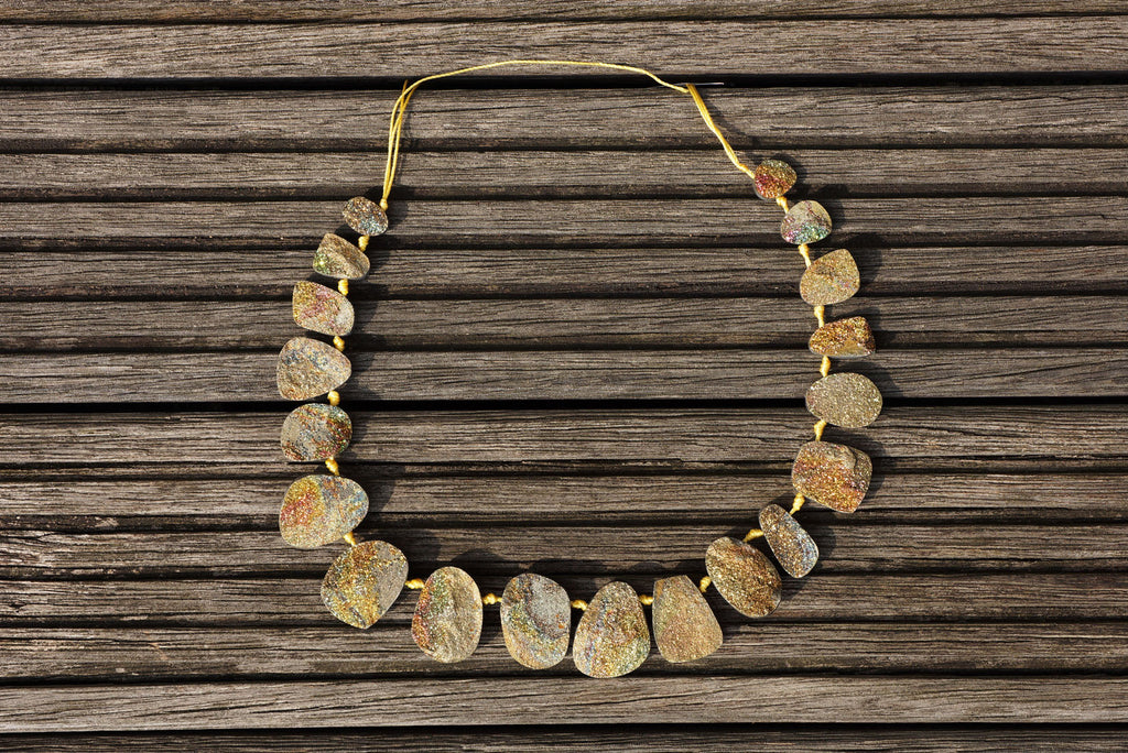 Rainbow (iridescent) pyrite is a relatively new gemstone recently discovered in Russia. This material comes in the form of “druzy” - a fine layer of miniature crystals coating a matrix. It offers a shimmering rainbow of colors, including shades of gold, green, pink and blue. This unique stone is found not far from Ulianovsk, on Volga River.