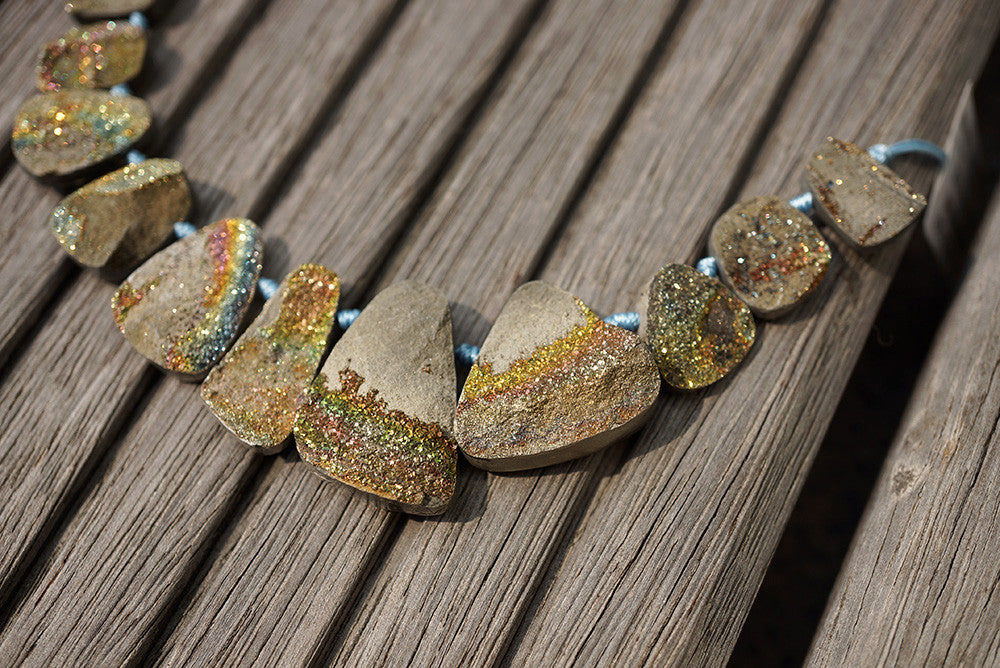 Rainbow (iridescent) pyrite is a relatively new gemstone recently discovered in Russia. This material comes in the form of “druzy” - a fine layer of miniature crystals coating a matrix. It offers a shimmering rainbow of colors, including shades of gold, green, pink and blue. This unique stone is found not far from Ulianovsk, on Volga River.