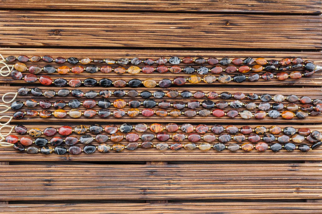Beautifully patterned jasper. This new find occurs in the Pilbara region of Western Australia. This gorgeous Jackson Pollock style Jasper has poles of streaky colours layered across each other creating a hatching effect across its surface. With colours in shades of grey, beige, red, mustard, dark brown with some black and white, usually coloured by iron oxide.